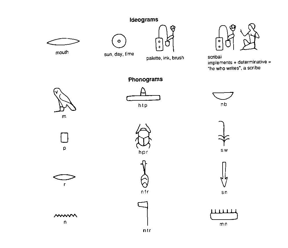 | Les hiéroglyphes étaient utilisés de trois manières: en tant qu’idéogrammes qui représentent un mot désignant un objet représenté visuellement par le hiéroglyphe, en tant que phonogrammes désignant des sons, ou en tant que déterminatifs qui fournissent des indices sur le sens sans écrire directement les sons. |
