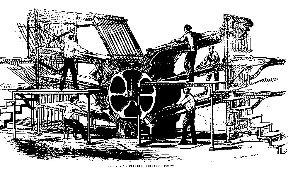 | Un « tireur » retire une feuille imprimée de la presse. À sa droite, le «batteur» encre la forme. À l’arrière-plan, des compositeurs composent les caractères. |