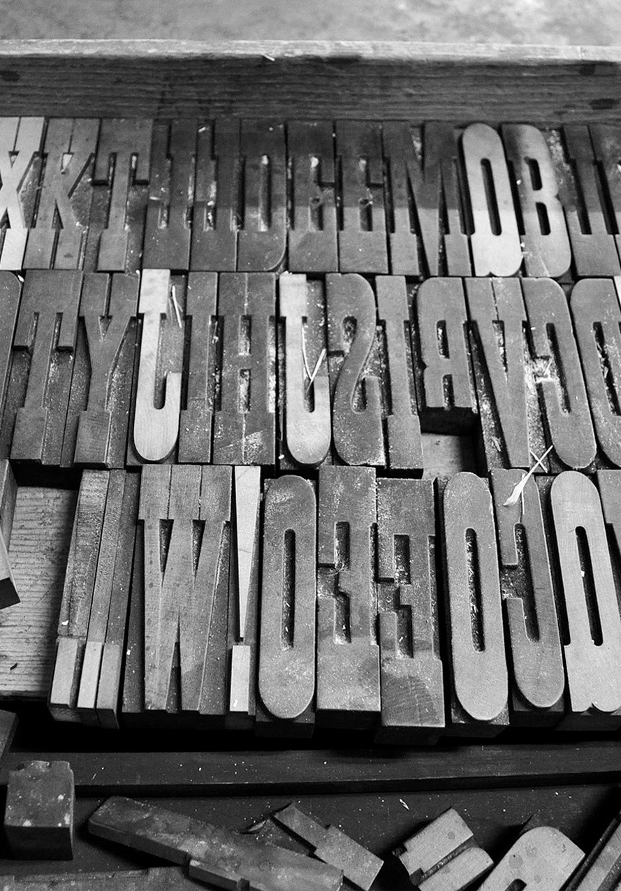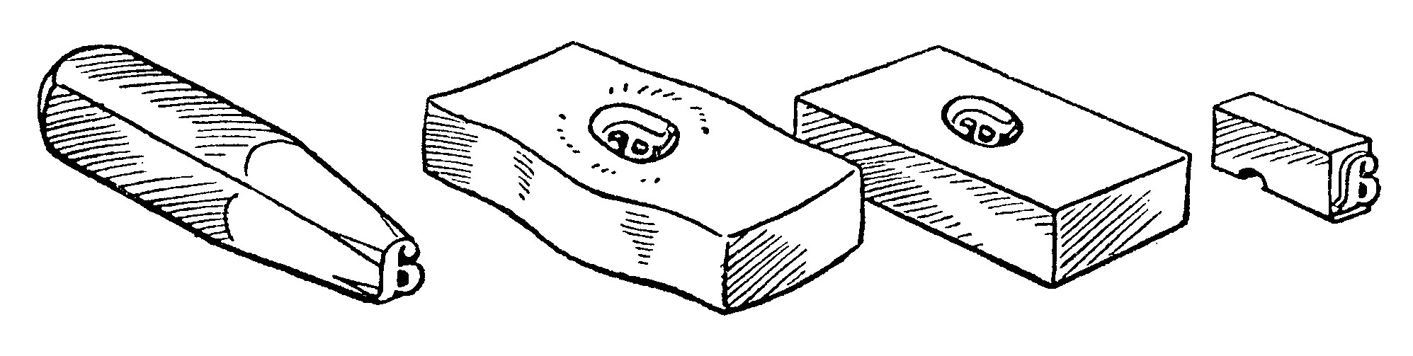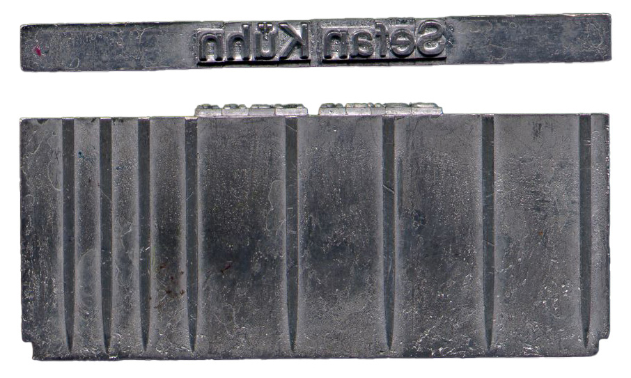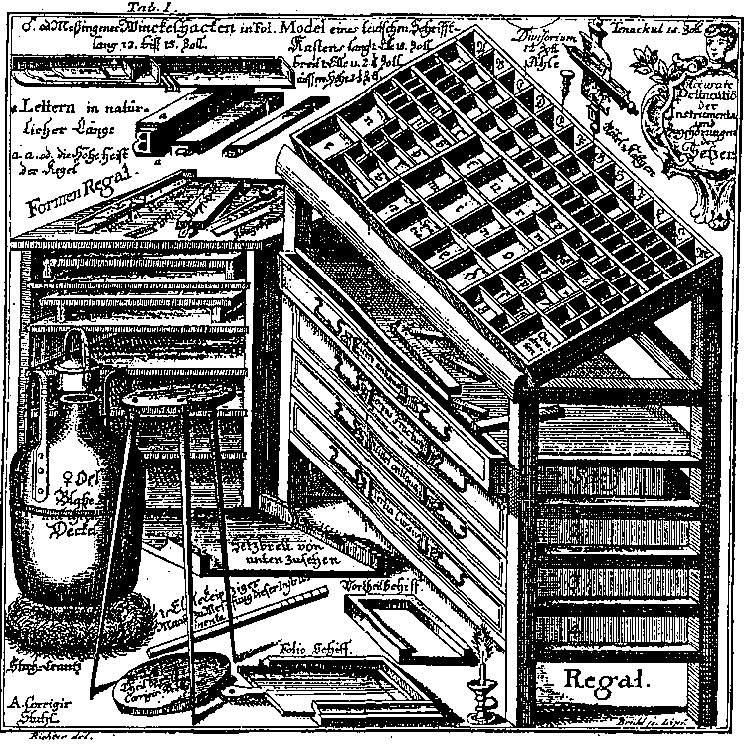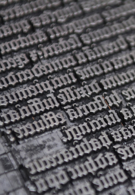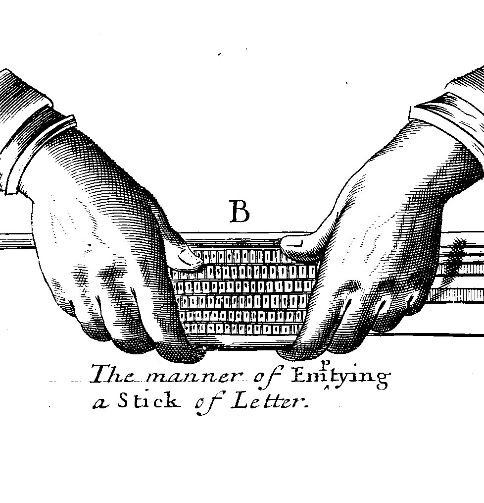 | Le graveur sculpte un poinçon à l’envers (acier). Le poinçon est utilisé pour frapper une matrice (cuivre). La matrice est utilisée pour fondre des caractères (alliage de plomb etc.) |