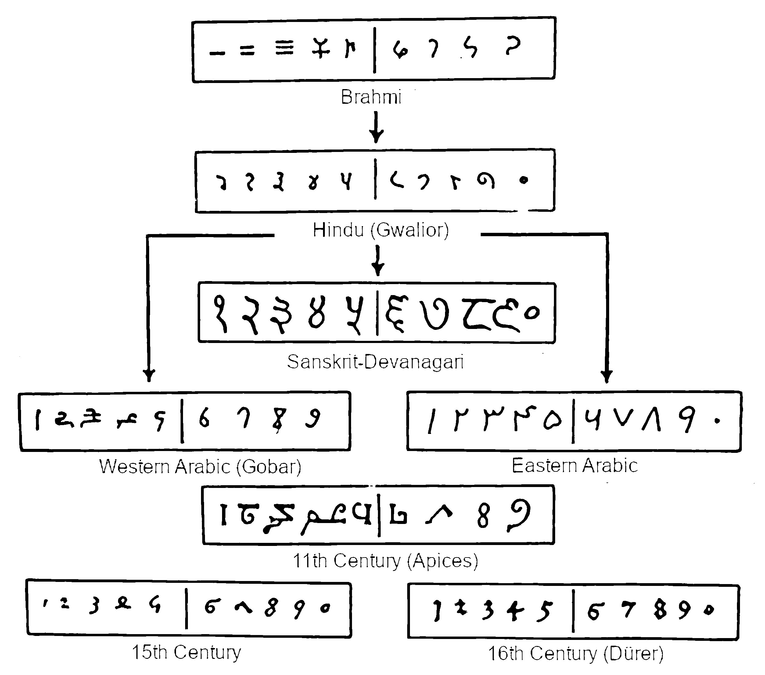 Les chiffres latins proviennent des chiffres indiens (Brahmi), qui ont transité par la civilisation arabe avant d’être adoptés en Europe et d’évoluer en leur forme actuelle.