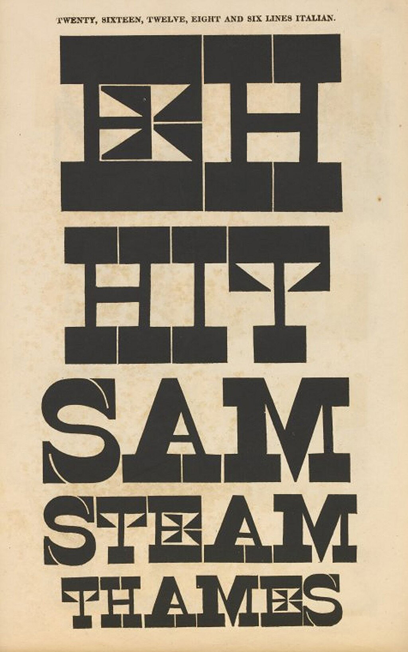 | Première apparition du terme «sans-serif», livre de spécimens de Vincent Figgins |