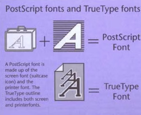 | PostScript (PS): deux fichiers (un pour l’écran et un pour l’impression). TrueType (TT): un seul fichier qui fait à la fois office de fichier d’écran et d’impression. |